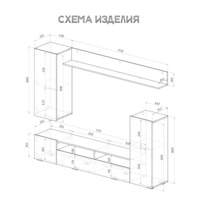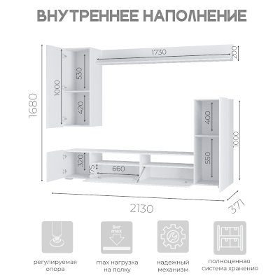 Стильный вариант гостиной Диаманд будет прекрасно смотреться в любом интерьере. Фасады без ручек и лишнего декора выглядят современно. На верхней открытой полке вы сможете разместить свои любимые сувениры или фотографии.