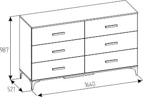Широкий вместительный комод с шестью ящиками – функциональный модуль, который подходит не только для хранения вещей, но и для размещения телевизора. Столешница и основание комода подчеркнуты контрастным декором Дуб Табачный. Фигурные металлические опоры и ручки из массива органично дополняют модуль.