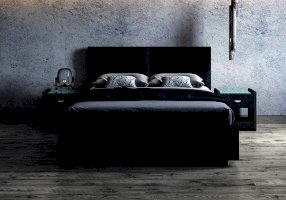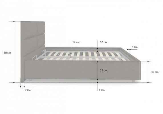Лаконичная модель с изголовьем из объемных прямоугольников, сшитых между собой. Царги кровати выполняются по технологии съемного чехла. Модель изготовлена из ДСП. Обратная сторона изголовья обита спандбондом, но, при желании, её можно выполнить из основного обивочного материала. В комплект кровати входит кроватное основание. Каркас основания выполнен из металла, ламели - из берёзы. При необходимости в комплект кровати можно включить подъемный механизм с бельевым ящиком, который существенно увеличит объем хранения вещей, а так же позволит легко производить уборку пыли под кроватью.