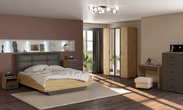 В этой коллекции мы используем два вида материала для основных элементов ЛДСП и для мягкой отделки декора кровати у изголовья.