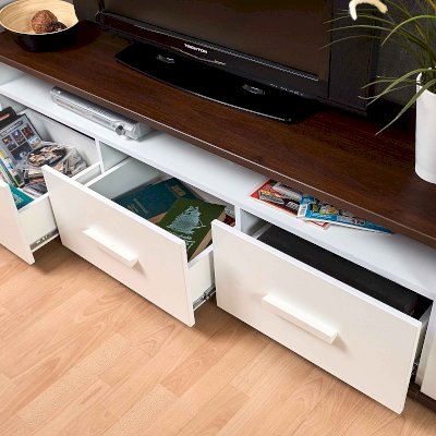 Норвуд 3 Тумба ТВ в белом минималистичном дизайне гармонично дополнит любую современную гостиную. Яркий акцент тумбы - контрастные верх и низ толщиной 22 мм в декоре Орех шоколадный. Три выдвижных ящика на шариковых направляющих плавно и бесшумно открываются за светлые ручки из массива дерева. Утопленная вглубь перегородка открытой ниши создает ощущение легкости и воздушности. На невысокой тумбе можно разместить телевизор диагональю до 65''.