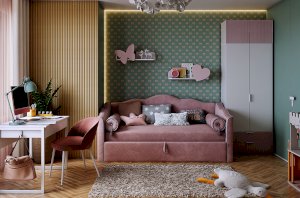 Комплектация: Навесная полка Сердечко, навесная полка Бабочка, двухдверный шкаф, двухдверная антресоль, письменный стол, кровать с подъемным механизмом